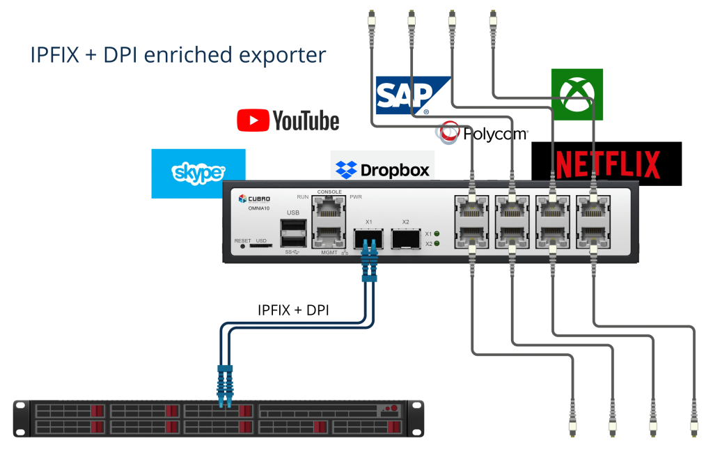 Custos可以作为一个网络传感器,通过被动地从网络流量中生成DPI输出来增强各种监控和安全解决方案。Custos可以被配置为将其深度包检测引擎产生的数据直接转发给第三方工具和应用程序,或者可以创建富含应用程序和协议信息的IPFIX记录并发送给收集器。Omnia10或Omnia20可以在线安装在活动链路上,使用内置的故障安全TAP,或在带外,从SPAN或镜像端口收集流量来执行这一功能。Omnia120可以部署在带外,从TAP收集流量,或与EX400旁路交换机配对,以高达100Gbps的速度进行故障安全的在线安装。此外,多台设备可以分布在网络中,甚至分布在多个站点上,以建立一个全面的可视性和监控平台。
