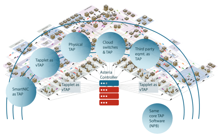 网络架构图显示,需要大量分流点才能捕获所有流量。顾名思义,物理分流器在构建网络时需要物理安装,以便为监控平台提供数据。需要时,可以使用管理平台打开Virtual Tap。一些实现还使用智能NIC。